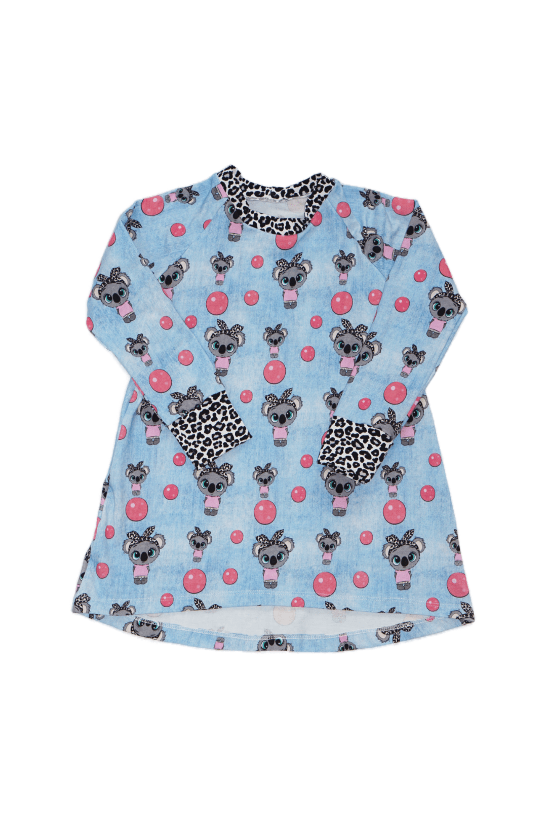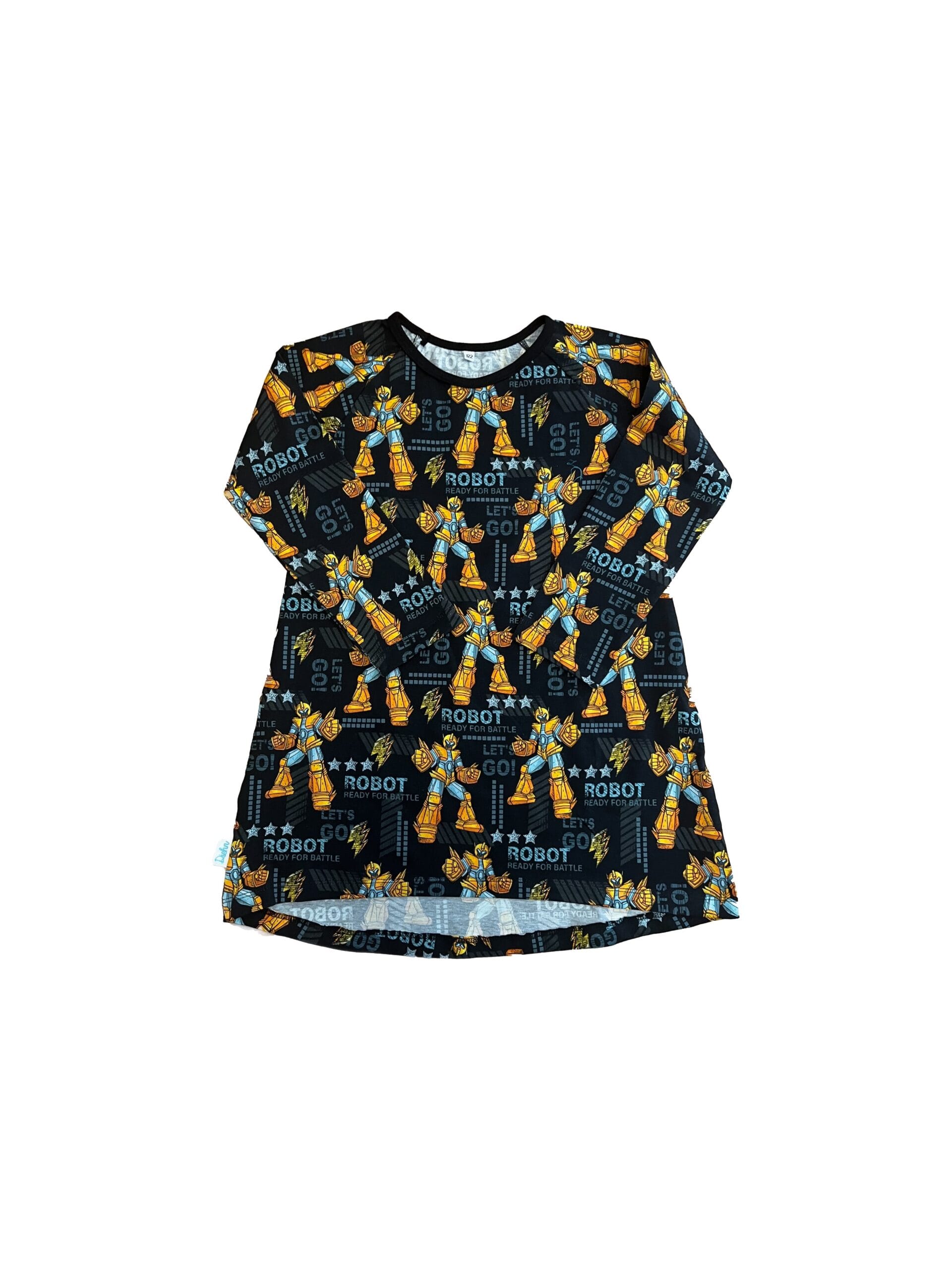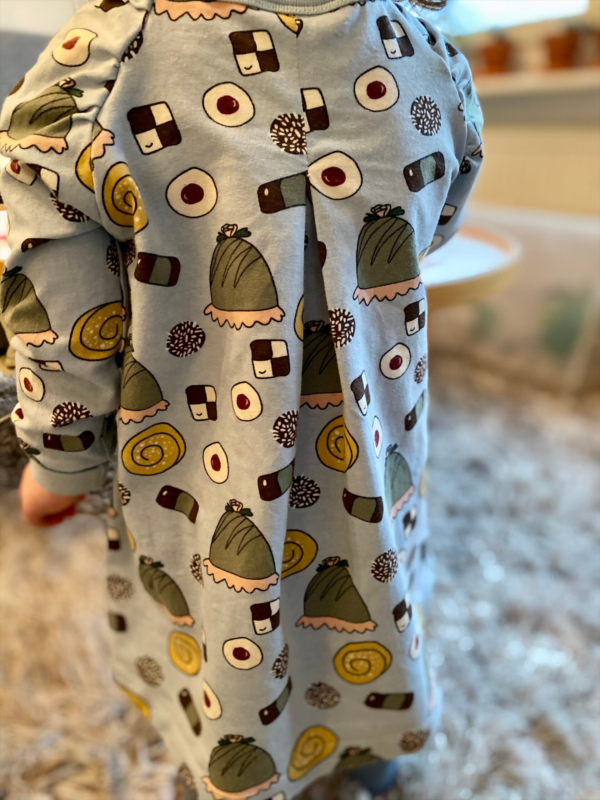 En enkel, rak klänning som passar alla barn. Rak modell utan kjolvidd – bekväm att röra sig i och lätt att dra på. Funkar lika bra som tunika över leggings eller baggybyxor.